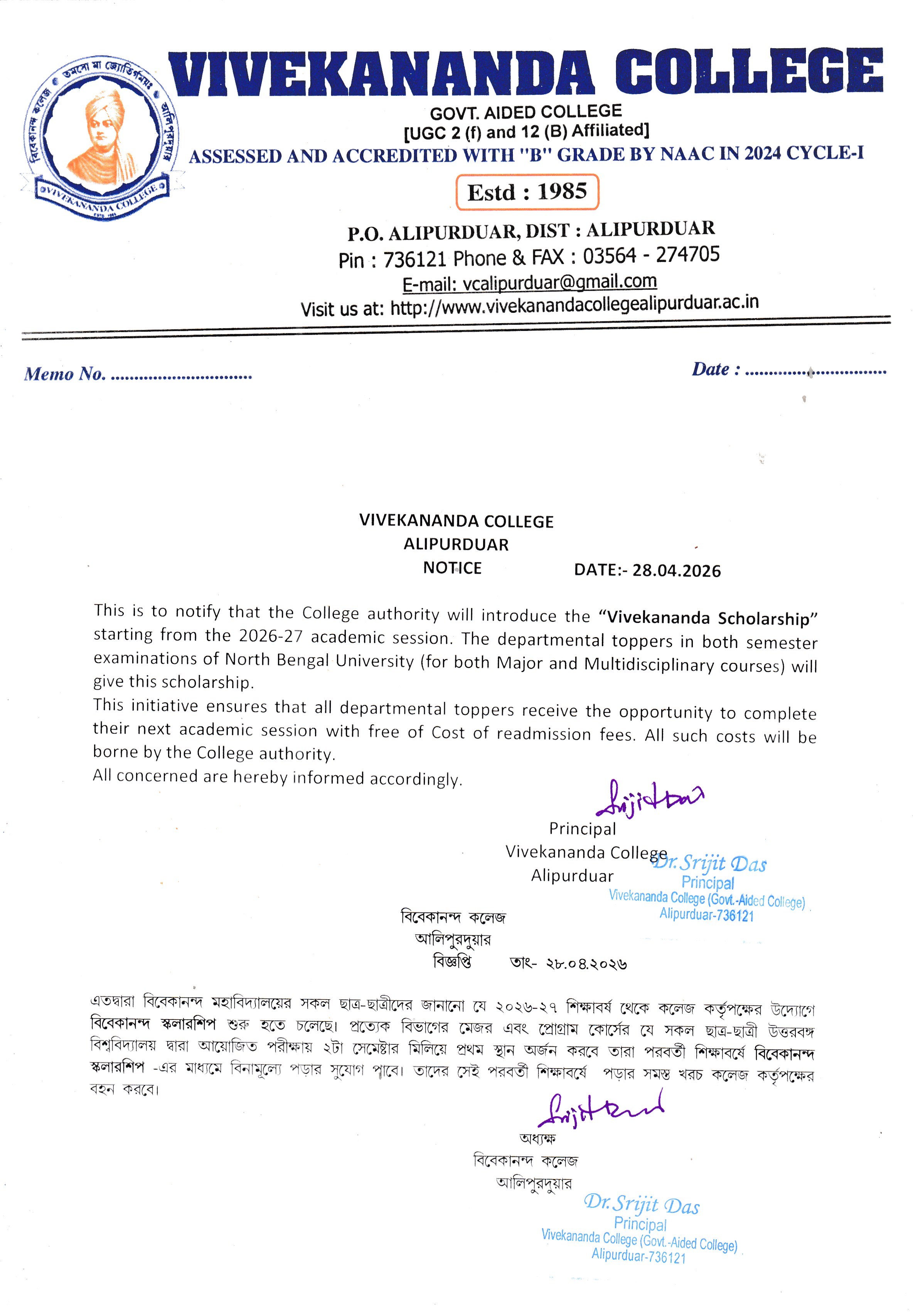 | 1 | Notice for Vivekananda Scholarship of Departmental Toppers | 28/04/2026 | 31/12/2026 |  |